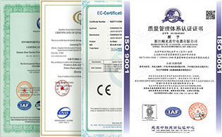 公司已通過(guò)ISO9001質(zhì)量管理體系、ISO14001環(huán)境管理體系、OHSAS18001職業(yè)安全健康管理三大體系認(rèn)證并取得相應(yīng)證書(shū)。通過(guò)國(guó)家型式試驗(yàn)檢測(cè),3c強(qiáng)制性產(chǎn)品認(rèn)證等。